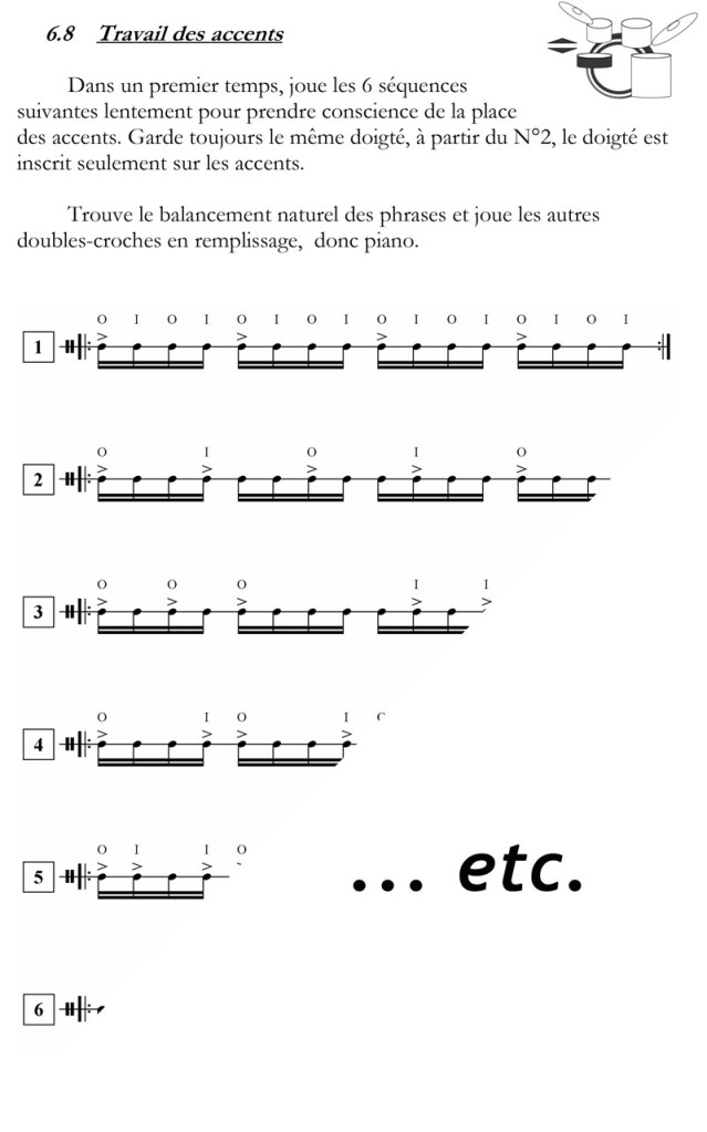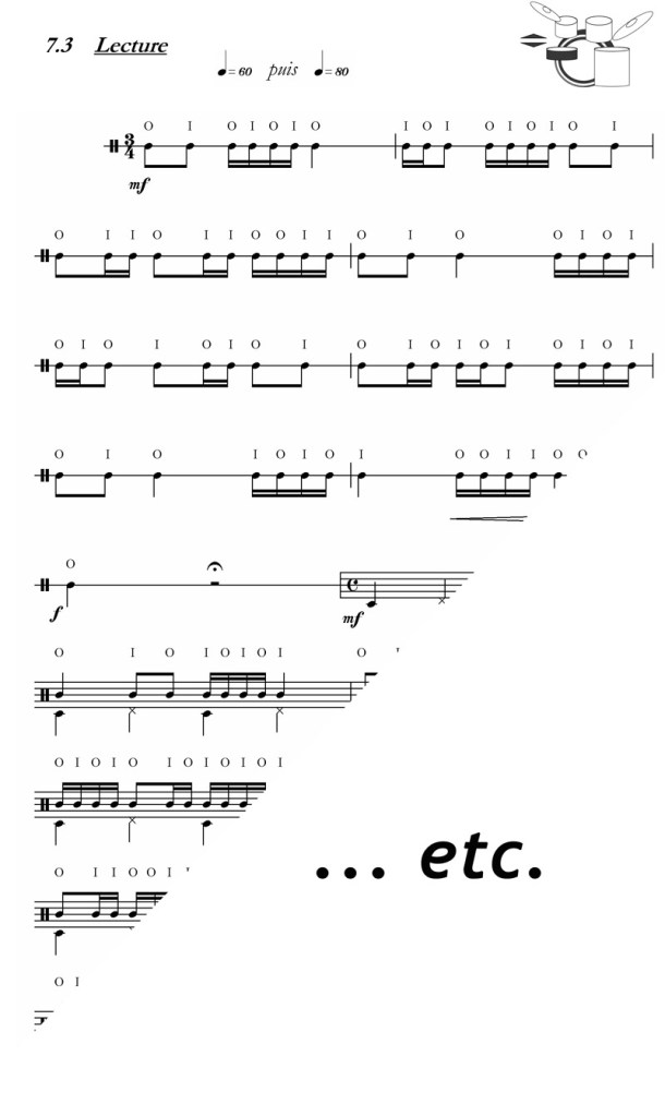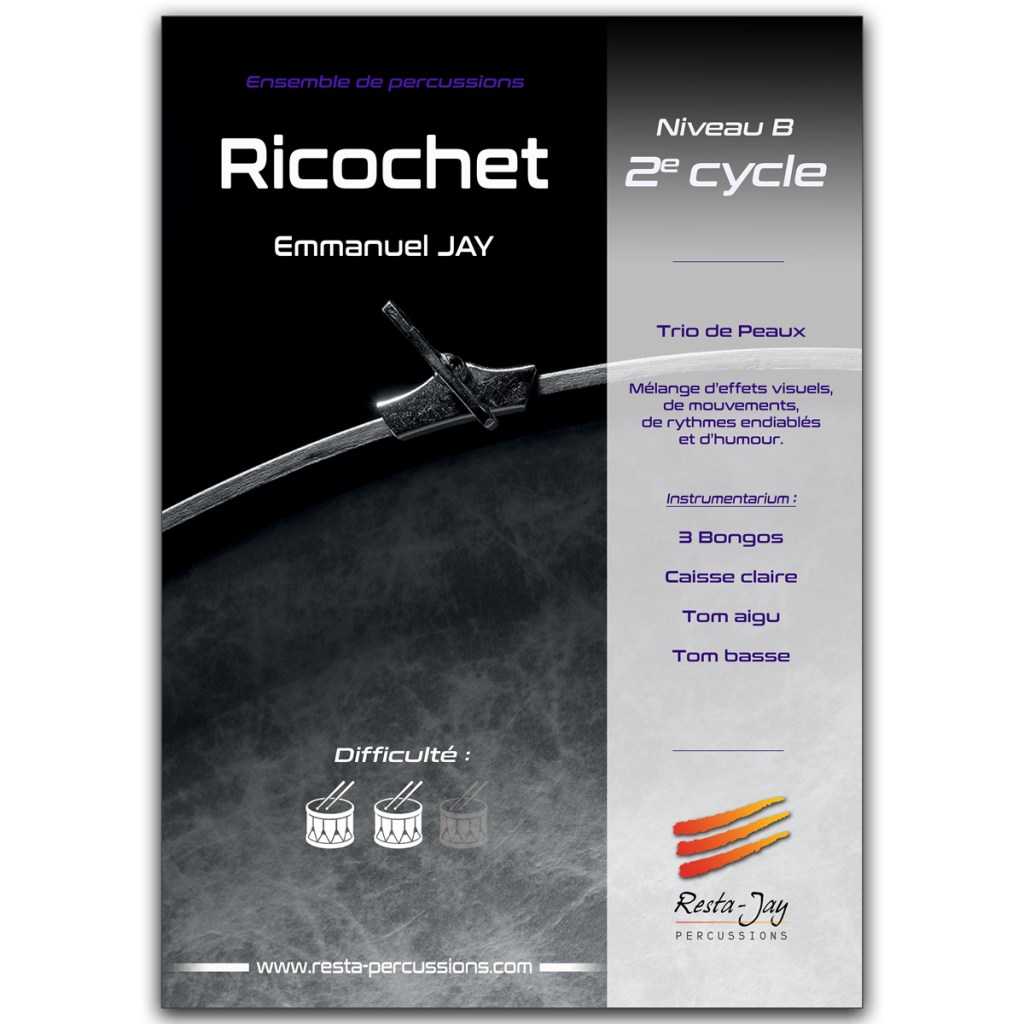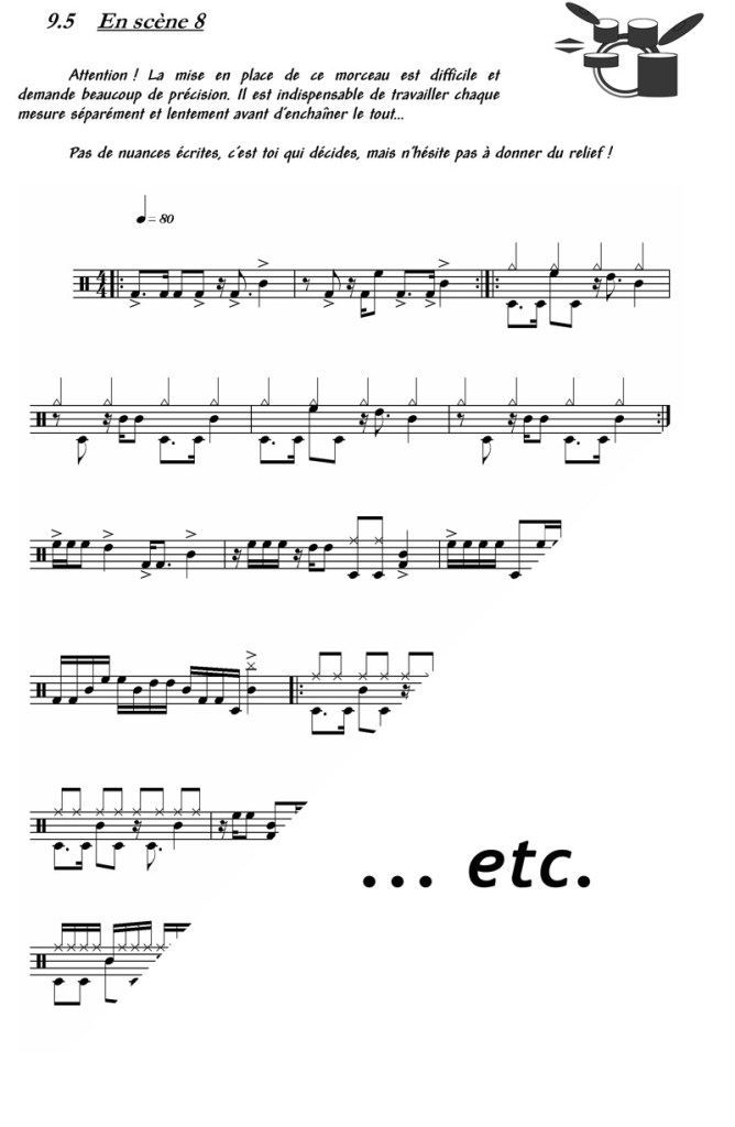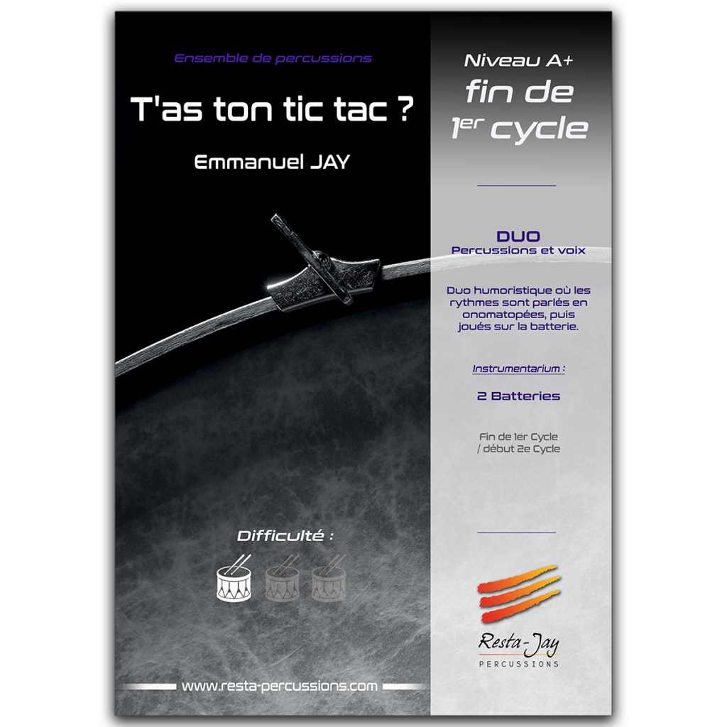 (3 paires de bongos, caisse claire, tom aigu et tom basse). Mélange de visuels, de mouvements, de rythmes endiablés et d’humour, cette pièce demande une certaine maîtrise de la part de ses exécutants.
