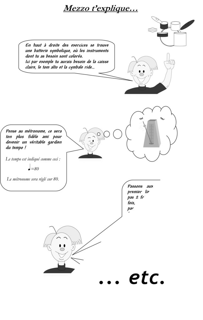 Elaborées de façon ludiques et progressives, les 110 pages de cette méthode regroupent les exercices indispensables à l’évolution d’un jeune batteur qui pourra compter sur l’aide et les conseils avisés de MEZZO… (Personnage virtuel de la méthode). Les professeurs y trouveront les textes d’auditions ou de concerts conçus pour mettre en valeur les jeunes musiciens en nécessitant peu de matériel. Les élèves, eux, pourront apprendre le b.a.-ba du batteur tout en s’amusant seul ou avec les copains.